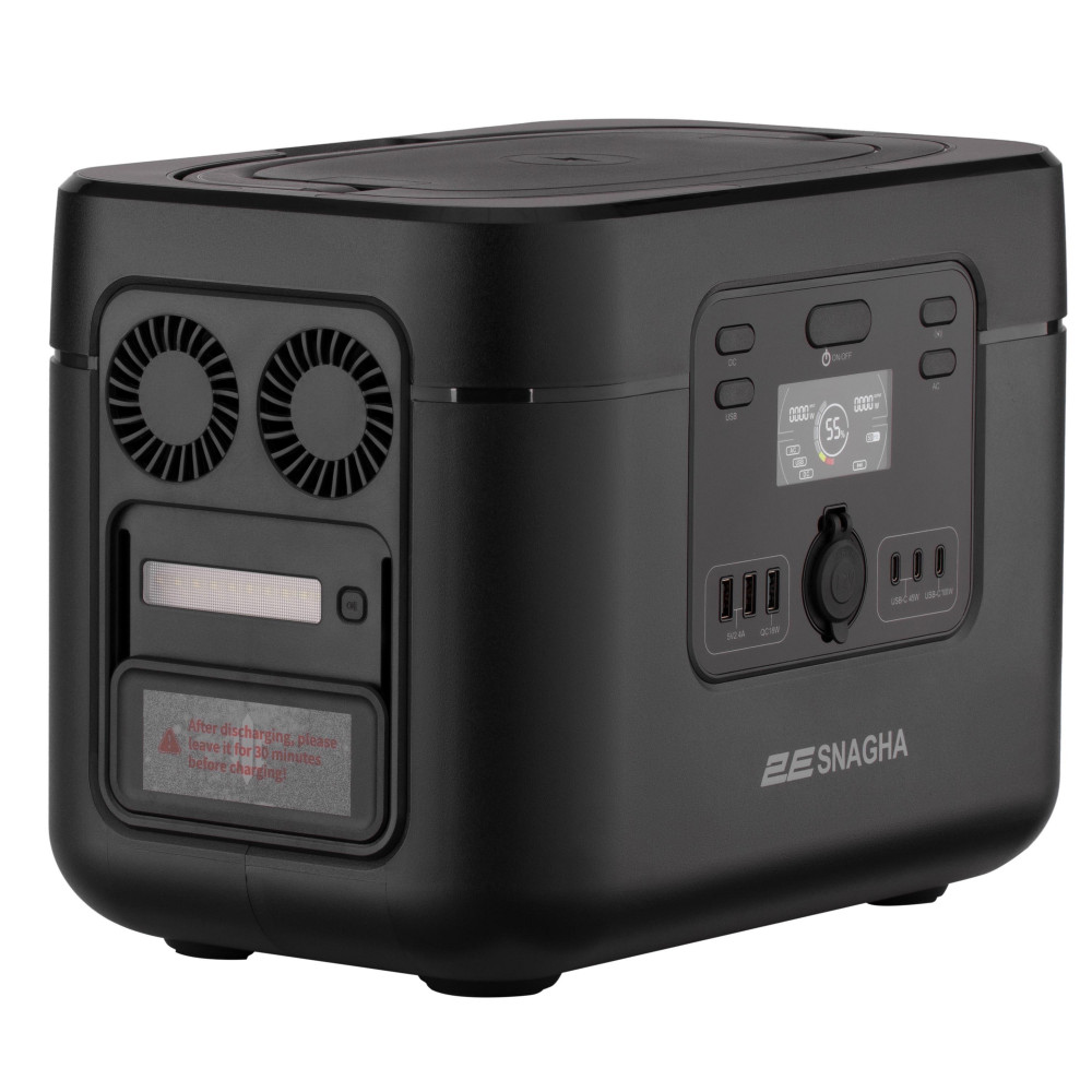 2Е Snagha 2 спроєктовано так, аби заряджати ще більше пристроїв, ніж її популярна попередниця. Широкі конструктивні можливості разом із номінальною потужністю інвертора із чистою синусоїдою 1 200 Вт забезпечують ефективну продуктивність. Довговічність роботи за інтенсивного використання Сучасні, безпечні та довговічні елементи живлення типу LiFePO4 (клас А) – запорука тривалого слугування пристрою навіть за інтенсивного використання. Дві розетки змінного струму 220 В типу Schuko із заземленням значно розширюють кількість видів споживачів, які можна заживити. Однією з ключових функцій є надшвидке й інтелектуальне заряджання від мережі 220 В або будь-якого іншого джерела змінного струму. Завдяки входу змінного струму до 1 200 Вт можливе заряджання силової станції від 0 % до 80 % лише за 40 хв, а до 100 % – лише за 1 год роботи від мережі чи генератора. При цьому зарядна станція не споживає пікову потужність на старті, а робить це дискретно, «вимірюючи» можливості мережі та не створюючи стартові пікові навантаження. 2Е Snagha 2 оснащена вбудованим контролером MPPT потужністю до 400 Вт і напругою від 10 В до 50 В із силою струму до 13 А, що дає змогу заряджати електростанцію за допомогою портативних сонячних панелей майже будь-якого номіналу потужності до 400 Вт. Наприклад, панель 400 Вт за сонячної погоди може зарядити зарядну станцію 2Е лише за 3 год! У разі паралельного використання є змога подвоїти сонячну потужність, використовуючи кожен MPPT станції. Також передбачено можливість заряджання через автомобільний прикурювач або за допомогою іншого акумулятора постійного струму. Модель оснащена рознімом XT60 DC і сумісна майже з будь-якою сучасною портативною сонячною панеллю. Із UPS (функція безперебійного живлення) використовувати ресурс (цикли) акумулятора можна лише тоді, коли це необхідно. За підключення зарядної станції 2Е Snagha 2 між джерелом електромережі та споживачем, у момент, коли в мережі є напруга, електрика проходить у «наскрізний» спосіб, тобто не залучаючи ані акумулятор, ані вбудований інвертор, що сприяє збереженню їхнього ресурсу. У момент припинення електропостачання через основну мережу зарядна станція переключає живлення на вбудований акумулятор із мінімальним затриманням, яке залишиться непоміченим навіть для ПК та іншої чутливої техніки. Використовувати зарядну станцію як типовий ДБЖ не рекомендовано. UPS-функція має обмежений час безперервного використання. Потужний захист Зарядна станція 2Е Snagha 2 оснащена сучасною платою BMS, яка передбачає шість систем захисту: від перезаряджання, глибокого розряду, перевантаження за струмом, перегрівання, короткого замикання, перенапруги. Бездротове заряджання пристроїв потужністю 15 Вт Передбачено швидке та зручне заряджання пристроїв без використання додаткових кабелів. При цьому активацію функції реалізовано окремо від інших портів постійного струму (USB), що дає змогу використовувати верхню кришку зарядної станції як столик для пристроїв, які заряджаються через розніми, не переймаючись щодо можливої взаємодії з індукцією. Переваги використання Вбудований ліхтарик може слугувати додатковим джерелом освітлення. Ергономічні руків’я з боків зумовлюють зручність транспортування. Конструкцією передбачено вбудоване відділення з кришкою для зберігання всіх необхідних кабелів і перехідників. ВАЖ