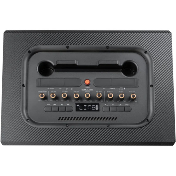 Колонка оснащена эстрадным компрессионно рупорным твиттером, который обеспечивает мощное, чистое и насыщенное звучание. Она идеально подходит для воспроизведения музыки любого жанра, от глубоких басов до кристально чистых высоких частот. Встраиваемая подставка для телефона и двух микрофонов обеспечивает удобное размещение гаджетов и аксессуаров.