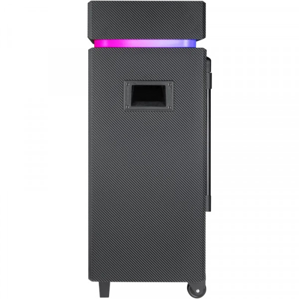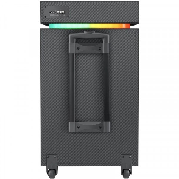Благодаря функции PowerBank и возможности питания посторонних устройств колонка может заряжать ваши гаджеты, что особенно удобно в дороге или на природе. Поддерживается питание от внешнего аккумулятора. Колонка оснащена выдвижной ручкой и встроенными колесиками, облегчающими ее перемещение по ровной поверхности, делая устройство портативным и удобным для транспортировки.