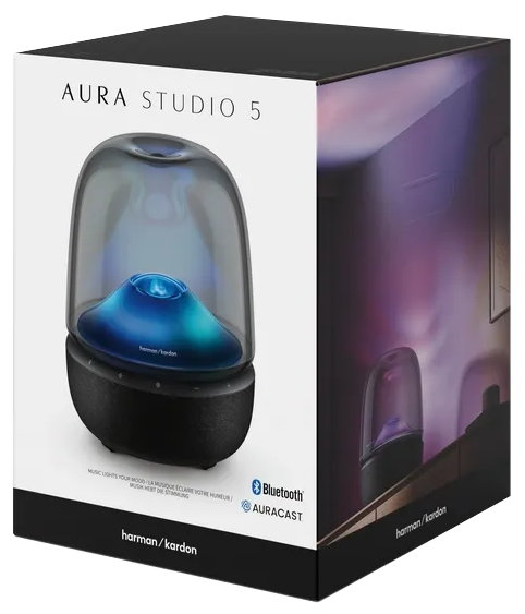 Harman Kardon Aura Studio 5 поєднує звук і світло, перетворюючи музику на досвід, який можна почути, побачити й відчути. Під час відтворення музики через Bluetooth м’яке навколишнє світло розливається з-під культового прозорого купола, змінюючи атмосферу простору відповідно до вашого настрою. Обирайте заспокійливі аквамаринові відтінки з плавними хвилеподібними рухами або тепле мерехтіння, схоже на полум’я, для затишних вечорів у колі друзів.