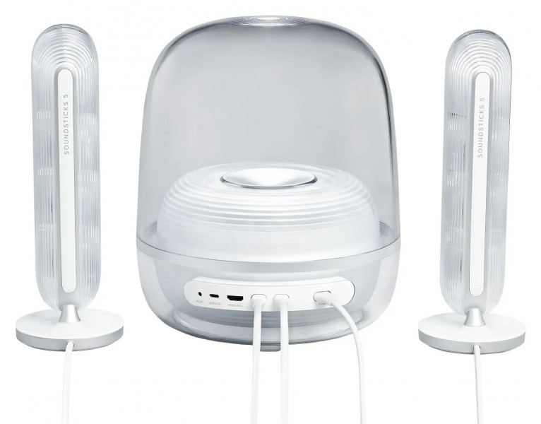 SoundSticks 5 — це переосмислення культового дизайну: повністю прозорий купол у стильних відтінках з преміальними металевими акцентами. Піднятий сабвуфер виконує не лише аудіофункцію, а й виступає вишуканим візуальним елементом. Продуманий інтерфейс під'єднання й інтуїтивно зрозуміле сенсорне керування, розташоване в нижній частині правого динаміка, забезпечують зручність у використанні.