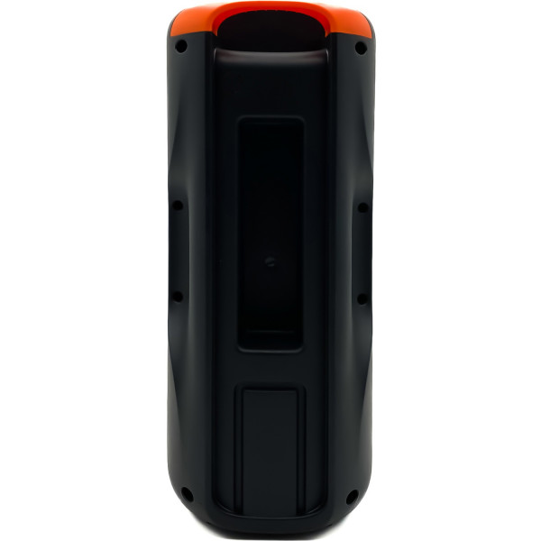На передней панели находятся кнопки управления и два динамика, скрытые за металлической перфорированной решеткой. Также на передней панели расположены: порт USB, вход AUX, микрофонный вход караоке Гнездо MIC 3,5, розетка вкл карты памяти microSD и розетка MicroUSB используется для зарядки. У верхней части устройства есть ручка, благодаря которой мы можем удобно переносить колонку в любое место. Под громкоговорителем есть профилированные ножки, благодаря которым громкоговоритель стоит стойко.