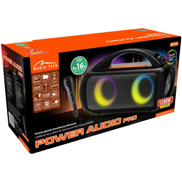 Функціональність Media-Tech Power Audio Pro (MT3184) вражає: тут є все — від вбудованого FM-приймача до LED-підсвічування, яке створює атмосферу справжнього свята. Картрідер полегшує доступ до ваших плейлистів, а дисплей дозволяє слідкувати за налаштуваннями та рівнем заряду.