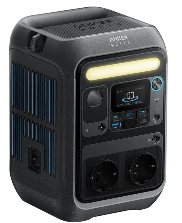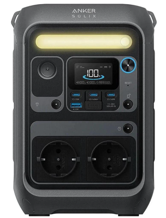 Anker Solix C300X (A1723311) являє собою компактне рішення для автономного живлення пристроїв. Пристрій оснащений 2 розетками AC 230 В з чистою синусоїдою і підтримує номінальну потужність до 300 Вт, а пікову - до 600 Вт. Для зарядки мобільних та інших гаджетів передбачено 3 порти USB Type-C з потужністю 140 Вт, 140 Вт і 15 Вт відповідно, а також 1 порт USB Type-A потужністю 12 Вт. Крім того, є автомобільна розетка потужністю 120 Вт і порт XT60 для підключення обладнання. Батарея на основі технології LiFePO4 має ємність 288 Вт-год і розрахована на 3000 циклів зарядки, забезпечуючи довгий термін служби. Станція підтримує функцію ДБЖ для захисту підключених пристроїв. Зарядка самої станції може виконуватися через розетку AC 230 В (330 Вт, 1,1 години), автомобільну розетку (2,4 години) або сонячну панель (100 Вт, 3,2 години). Можливість підключення сонячної панелі робить Anker Solix C300X (A1723311) зручним для використання поза доступом до мережі. Енергостанція оснащена дисплеєм для відображення параметрів роботи, вбудованим ліхтариком і підтримує віддалене управління для зручного контролю. Універсальність портів і компактний дизайн роблять Anker Solix C300X (A1723311) ідеальним вибором для подорожей, кемпінгу та резервного живлення..png)