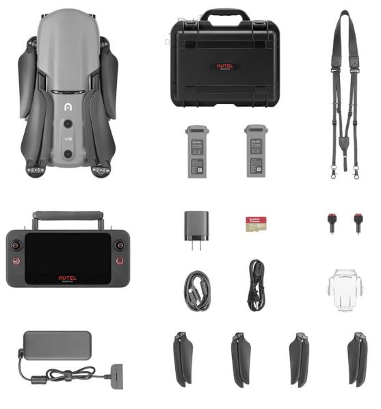 | Комплектація | Акумулятори 2 шт; Запасні лопаті 2 шт; Інше Зарядний пристрій /2шт (дрон, пульт ДУ); кабель живлення; пульт дистанційного керування /Autel Smart Controller SE; дрон /(включаючи акумулятор, пропелери, кришку підвісу та SD-карту на 32 ГБ); посібник користувача; кабель зарядного пристрою пульту ДУ; шнурок для пульта ДК; запасний джойстик керування (пара); захисний кейс |