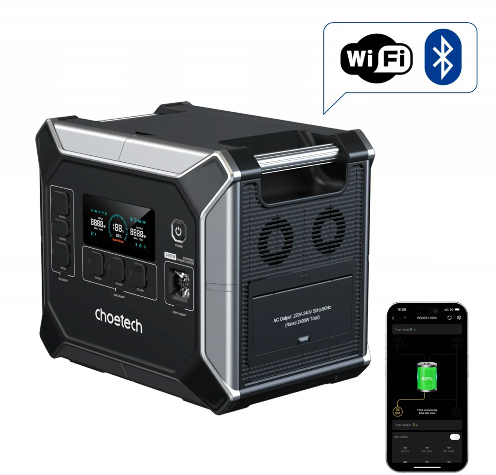 Портативна зарядна станція CHOETECH BS067 (2400W) з модулями Wi-Fi та Bluetooth призначена для автономного живлення електронного обладнання.