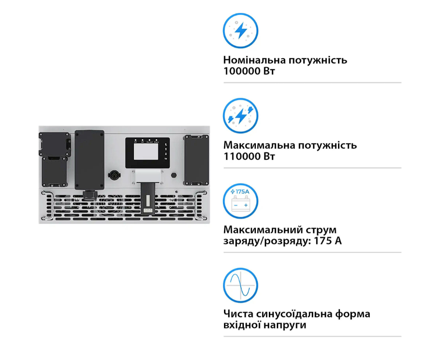 Номінальна потужність: 125 кBт / Кількість фаз: трифазний / Форма вихідного сигналу: чиста синусоїда / Напруга акумулятора (АКБ): 630-1000 B /