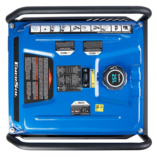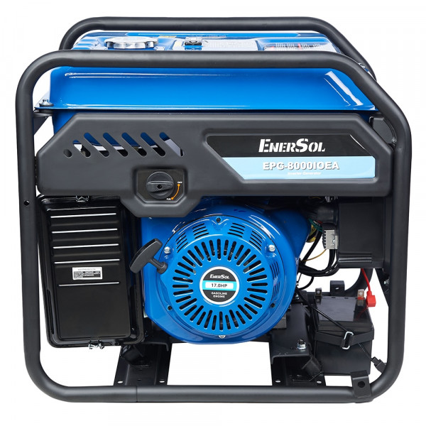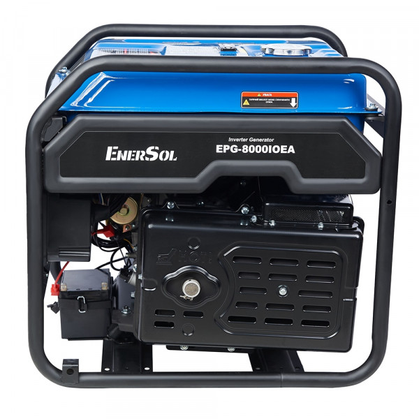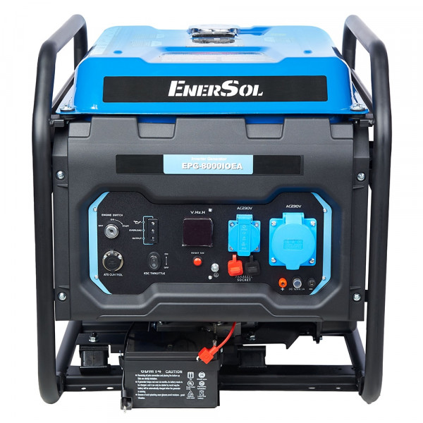 EnerSol EPG-8000IOEA – бензиновий інверторний генератор з однофазним виводом 230 В при 50 Гц, номінальною потужністю 7 кВт та максимальною 8 кВт з коефіцієнтом потужності 1. Двигун GP460 чотиритактний з одним циліндром об'ємом 460 см³ та потужністю 12,68 кВт обертається на 3000 об/хв, забезпечуючи номінальний струм 30,4 А змінного та 8,3 А постійного. Об'єм мастила – 1,1 л, паливний бак – 25 л з витратою 0,35 л/кВт·год, охолодження повітряне в рамному виконанні з захистом IP23. Електростартер з ручним механізмом полегшує запуск, мультиметр моніторить напругу, частоту та струм, датчик мастила зупиняє роботу при низькому рівні, індикатор перевантаження блокує при надмірному навантаженні. Верхнє розташування клапанів OHV підвищує ефективність спалювання, сталева рама захищає компоненти, експлуатація можлива при -5...+40 °C та вологості до 95 %, з опцією автоматики без функції зварювання.