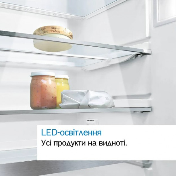 Енергозберігальне LED-освітлення допоможе роздивитися продукти навіть у дальніх кутах холодильника. Довговічні енергоощадні світлодіоди рівномірно освітлюватимуть вміст холодильника без відблисків. Хай усі продукти будуть на видноті.