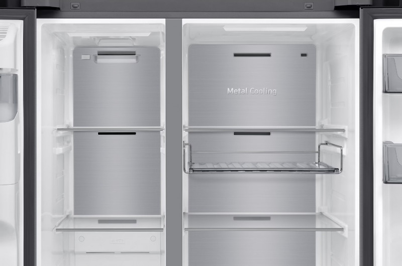 Підтримуйте оптимальну температуру всередині холодильника, щоб продукти залишилися свіжими, навіть якщо ви часто відкриваєте і закриваєте дверцята. Металева панель Metal Cooling у задній стінці утримує холод з повітря і допомогає швидко відновити будь-які втрати тепла.