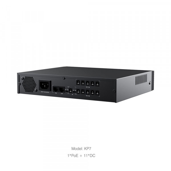 В вашем распоряжении будут 10 портов DC с выходной мощностью 9/15/18 Вт и порт PoE с мощностью 15/24 Вт. О текущем состоянии питания ИБП будет сообщать LCD дисплей.