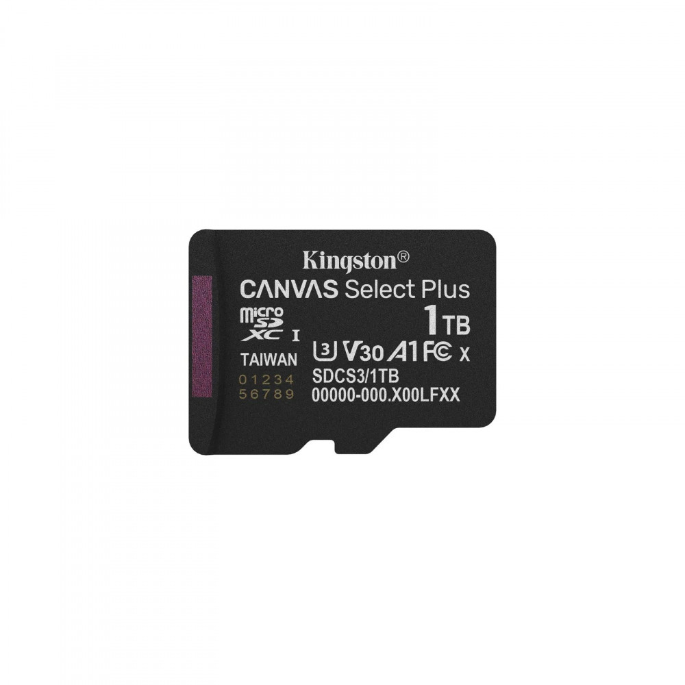 Карта пам'яті Kingston 1TB microSDXC class 10 UHS-I U3 V30 A1 Canvas Select Plus (SDCS3/1TB) втілює у собі оптимальний баланс потужності та надійності, забезпечуючи вас обсягом 1 ТБ для безмежного зберігання ваших файлів. Завдяки швидкості читання до 150 МБ/с, карта миттєво відкриває доступ до вашого контенту, гарантуючи блискавичну продуктивність.
