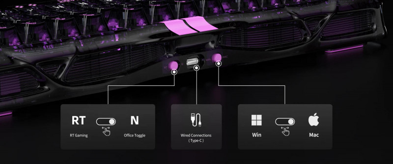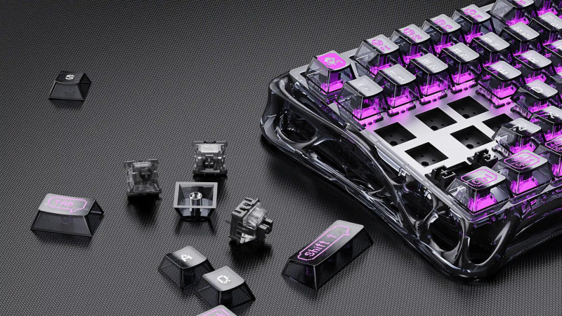 RGB-підсвітка охоплює клавіші та бічні зони, з можливістю індивідуального налаштування кожної клавіші. Налаштування проводиться через веб-інтерфейс без встановлення додаткового ПЗ. П'ятишарова акустична система з демпфуючими прокладками зменшує вібрації та формує чистий звук натискання. Hot-swap сокети дозволяють легко змінювати перемикачі для адаптації під різні сценарії.