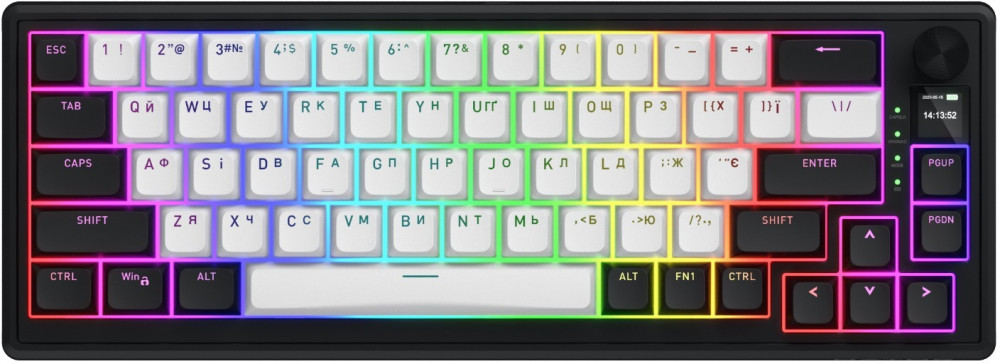 Клавіатура підтримує tri-mode підключення: 2.4 ГГц, Bluetooth 5.3 та дротове USB, при цьому в бездротових режимах зберігаються повноцінні 8000 Гц. Вбудований акумулятор на 8000 мАг гарантує до 533 годин автономної роботи без підсвічування або до 24 годин з активною RGB-підсвіткою. Додатково є компактний TFT-екран 0.85 дюйма для відображення анімацій, статусу чи корисної інформації, а також функціональний кноб для швидкого керування гучністю та іншими параметрами.