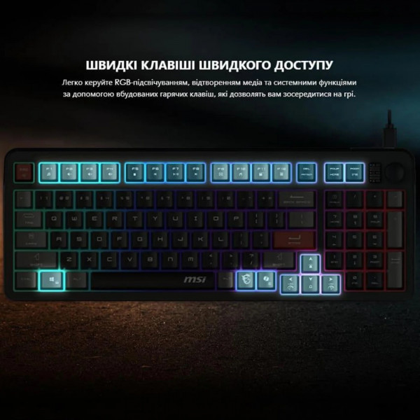 Клавіатура підтримує три розкладки — англійську (EN), українську (UKR) та російську (RU), що дозволяє легко перемикатися між мовами за допомогою комбінацій клавіш (наприклад, Alt+Shift). Мембранна технологія забезпечує тихий хід клавіш із м’яким відгуком, що ідеально підходить для тривалого набору тексту чи ігор без надмірного шуму. Функціональні клавіші (F1-F12) дозволяють швидко налаштовувати мультимедійні опції, підсвічування чи інші параметри, а спеціальні ігрові клавіші (наприклад, WASD) підсвічуються яскравіше для зручності геймерів.