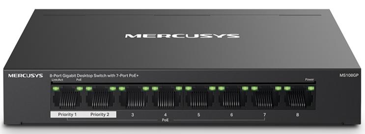 Mercusys MS108GP — 8-портовий гігабітний настільний комутатор з 7-портовим PoE+. Всі вісім портів MS108GP є гігабітними, з них сім портів PoE+ (1-7). Кожен порт PoE+ підтримує максимальну потужність 30 Вт і сумісний з пристроями, що працюють за стандартом 802.3af/at. Загальний бюджет живлення 65 Вт PoE дозволяє використовувати пристрій у різних сферах, зокрема для відеоспостереження в офісах, гуртожитках і на малих підприємствах. З ним повністю сумісні IP-камери, точки доступу, IP-телефони, ПК, відеореєстратори тощо.