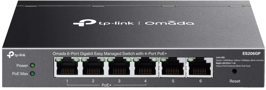TP-Link Omada ES206GP — це 6-портовий гігабітний керований комутатор із 4 портами PoE+, призначений для малих і середніх підприємств, зокрема для мереж відеоспостереження. Оснащений шістьма портами RJ45 зі швидкістю 10/100/1000 Мбіт/с, з яких чотири підтримують стандарти 802.3af/at PoE+ із загальним бюджетом PoE 65 Вт і максимальною потужністю 30 Вт на порт. У розширеному режимі забезпечує передачу PoE на відстань до 250 м зі зниженням швидкості до 10 Мбіт/с.