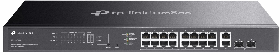 TP-Link Omada ES220GMP — це 20-портовий гігабітний керований комутатор із 16 портами PoE+, призначений для малих і середніх підприємств, зокрема для мереж відеоспостереження. Він оснащений 16 гігабітними портами RJ45 із підтримкою стандартів 802.3af/at PoE+, двома гігабітними портами RJ45 та двома гігабітними SFP-слотами. Загальний бюджет PoE становить 250 Вт із максимальною потужністю 30 Вт на порт. Пристрій підтримує передачу PoE на відстань до 250 м, що ідеально підходить для віддалених пристроїв, таких як IP-камери.