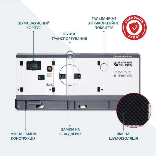 Könner & Söhnen KS 110-3BE є стаціонарним дизельним генератором для об’єктів із високими вимогами до надійності та потужності. Поєднання двигуна Baudouin, цифрового керування та захищеного корпусу формує збалансоване рішення для тривалої експлуатації.