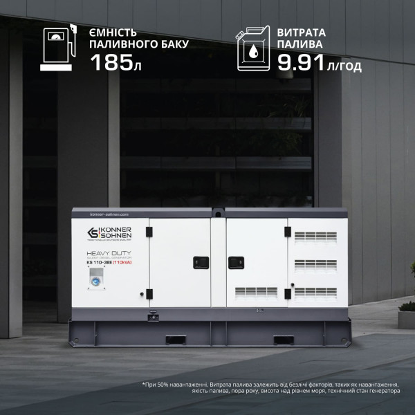 Дизельний генератор Könner & Söhnen KS 110-3BE розроблений для безперервного електропостачання об’єктів з підвищеним енергоспоживанням. Модель входить до серії HEAVY DUTY та орієнтована на стаціонарну експлуатацію у промисловому, аграрному та інфраструктурному середовищі.