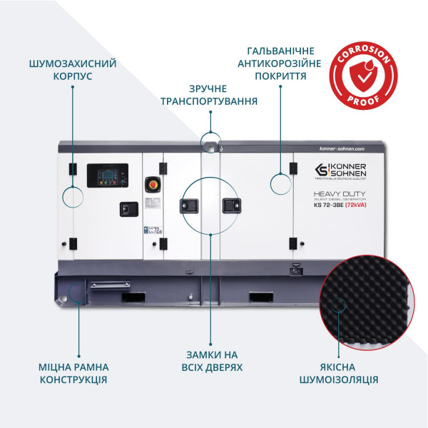 Konner&Sohnen KS 72-3BE поєднує потужний двигун, захисний корпус та автоматичний контроль у стаціонарному дизайні, що робить його практичним для забезпечення безперервного живлення на об’єктах з високим енергоспоживанням.