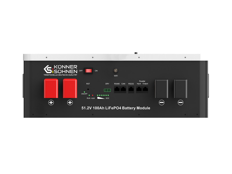 Завдяки своїм технічним характеристикам акумуляторні батареї KS LB 48–100 є ідеальним рішенням для забезпечення енергією в найрізноманітніших сферах життєдіяльності — від облаштування резервного живлення будинків, котеджів до забезпечення електроенергією комерційних установ, медичних закладів, спортивних споруджень та інших об'єктів. Застосування LiFePO4 відкриває нові можливості і має низку істотних переваг: Довгий термін служби – акумулятори здатні витримувати велику кількість циклів заряджання-розряджання (до 6000* циклів) без значної втрати ємності, це дозволяє використовувати їх багато років. Високий рівень безпеки - мають високу хімічну стабільність, що знижує ризик перегріву, вибуху або загоряння, працюють ефективно в широкому діапазоні температур, що робить можливим їх підключення в різних кліматичних умовах. Швидкий заряд: суттєво скорочує час заряджання, що є важливою перевагою для багатьох застосувань. Мають високий коефіцієнт корисної дії (ККД), а це означає менші втрати енергії під час заряджання та розряджання. Екологічно чисте джерело енергії без шуму. Не забруднює довкілля шкідливими викидами в ході експлуатації, не впливає на клімат у регіоні. Їх можна використовувати в будь-якому місці, не турбуючи інших. Під час роботи вони не виділяють шкідливих газів, тому їх встановлюють і у закритих приміщеннях. Дуже проста в експлуатації. Легко обслуговується: не потребує постійного поповнення паливом, змащення мастилом, заміни фільтрів та доливу електроліту. Батарея має вбудовану систему управління та моніторингу (BMS), яка дозволяє контролювати та відстежувати напругу, струм, температуру та забезпечує її довготривале функціонування. Завдяки комплексному контролю всіх параметрів батареї, BMS значно підвищує її безпеку. Основні переваги BMS: Захист від перенапруги: BMS запобігає перезаряду батареї, що може призвести до її деградації та навіть вибуху. Захист від глибокого розряду: контролює рівень заряду батареї і не дозволяє їй розрядитися нижче допустимого рівня, що також негативно впливає на її життєвий цикл. Балансування елементів: BMS забезпечує балансування елементів, тобто підтримує однаковий рівень заряду кожного елемента, що продовжує її термін служби. Термозахист: BMS моніторить температуру батареї і відключає її при перегріванні або переохолодженні, що може призвести до пошкодження. Захист від короткого замикання: У разі короткого замикання BMS швидко відключає батарею, запобігаючи її пошкодженню та потенційній пожежі. Оптимізація заряду та розряду: BMS контролює параметри заряду та розряду в оптимальних межах, що збільшує термін служби та захищає від пошкодження. Моніторинг стану батареї: BMS збирає інформацію про стан батареї (напруга, струм, температура тощо) і передає її на зовнішні пристрої. На корпусі міститься РК дисплей, який відображає параметри акумуляторної батареї та надає інформацію про її стан. Ще одна перевага KS LB 48–100 – можливість паралельного підключення декількох акумуляторних батарей, що дозволяє збільшити загальну ємність системи зберігання електроенергії та підвищити час роботи системи в цілому. Комунікаційні порти CAN, RS232 та RS485 надають широкі можливості для взаємодії з іншими пристроями, дозволяють здійснити налаштування та використовуються для віддаленого моніторингу, завантаж