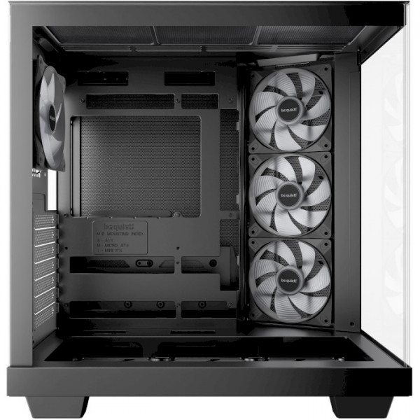Light Base 500 LX Black відразу з коробки оснащений 4 вентиляторами: один Light Wings LX 120mm PWM в тильній частині та три 120mm PWM-вентилятори з реверсивними лопатями на боковій частині. Всі вентилятори мають 16 світлодіодів, розташованих всередині крильчатки, що створює неперевершений візуальний вигляд ARGB підсвічування. Реверсивні лопаті забезпечують привабливий зовнішній вигляд вентиляторів з фронтальної частини.