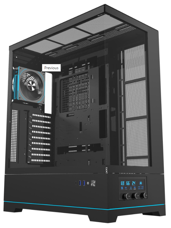 Серед ключових особливостей — розширена підтримка охолодження: чотирирівнева система з регулюванням швидкості вентиляторів, реальним часом відображення температури, можливістю встановлення до 11 вентиляторів розміром 120 мм та радіаторів до 480 мм (збоку). Корпус підтримує материнські плати форматів ATX, M-ATX та ITX, відеокарти довжиною до 420 мм та процесорні кулери висотою до 180 мм.
