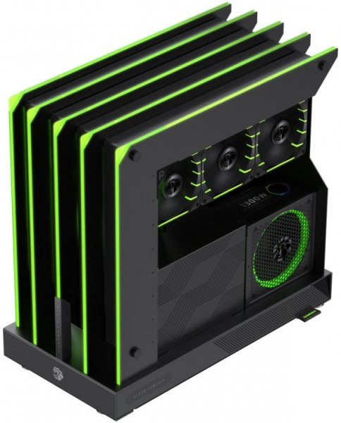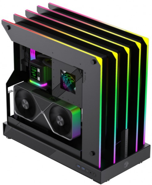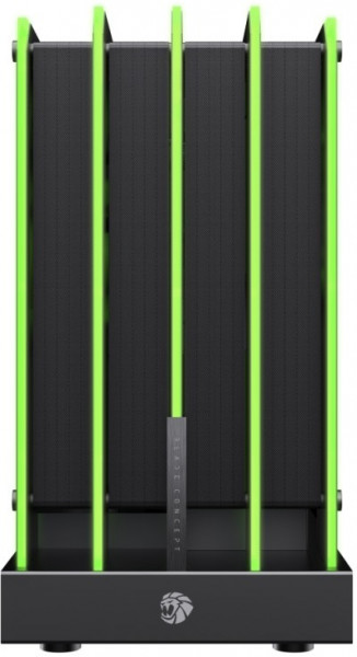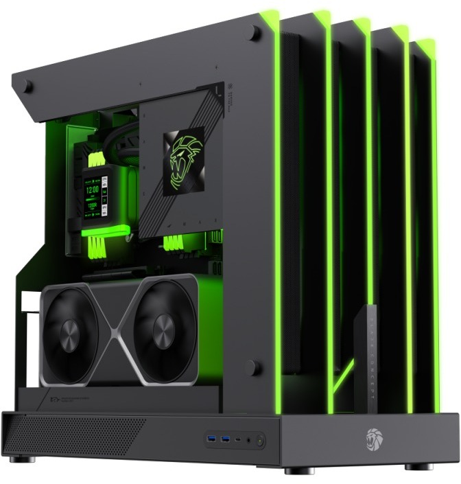 Ця модель має унікальний open-frame дизайн з відкритими боковими панелями, що забезпечує максимальний потік повітря та повний огляд компонентів, ідеально підходячи для шоу-кеїв чи кастомних збірок з RGB-елементами. Фронтальна та верхня частини прикрашені "кігтями лева" — металевими лезами з високоякісної нейлонової сітки, яка фільтрує пил, але пропускає повітря, а 277 ARGB-світлодіодів створюють динамічні ефекти "кігтів" з синхронізацією через хаб GMX V4.0.