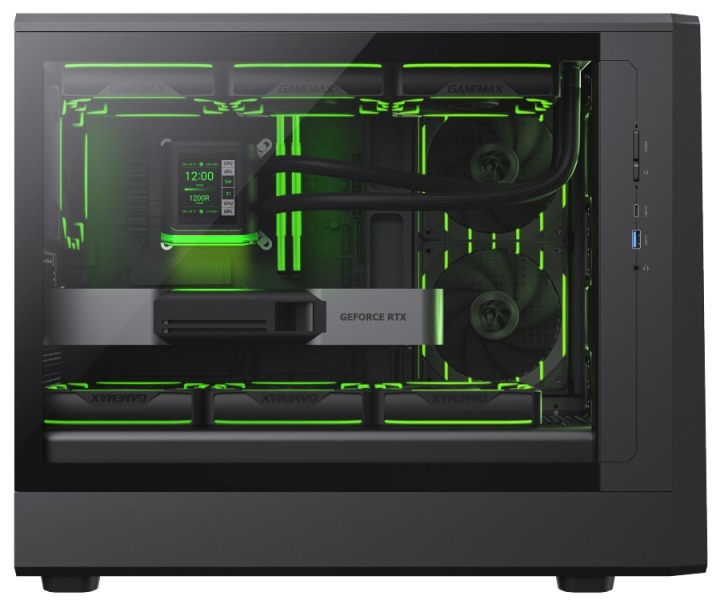 Охолодження в Gamemax Claw 360 реалізовано на високому рівні: корпус підтримує встановлення до 12 вентиляторів діаметром 120 мм, з яких чотири ARGB/PWM-фани постачаються в комплекті разом з інтегрованим контролером для синхронізації освітлення. Така конфігурація забезпечує стабільний потік повітря, запобігаючи перегріву під час інтенсивних навантажень у іграх чи рендерингу. Вбудований регульований кронштейн для відеокарти запобігає просіданню GPU, додаючи надійності збірці, а сітчасті панелі на верхній і нижній частинах корпусу доповнюють систему вентиляції, створюючи природний потік.