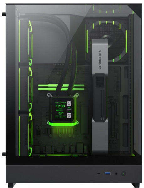 Зовнішній дизайн Gamemax T20 вражає панорамними панелями з загартованого скла на трьох сторонах — фронтальній, бічній та верхній, — які забезпечують повний огляд апаратної начинки без перешкод, дозволяючи демонструвати RGB-підсвічування та кастомні компоненти.