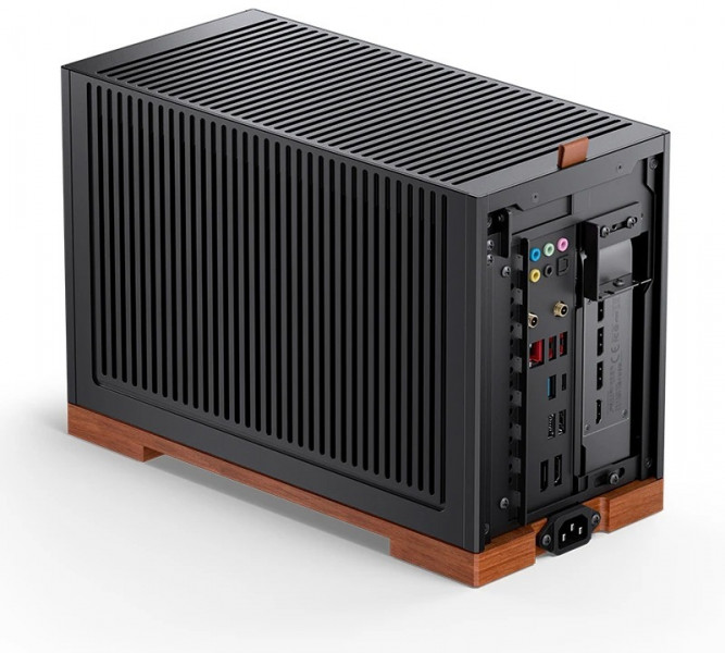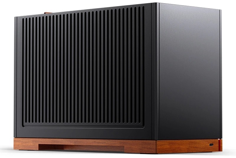 Jonsbo T9 — це компактний корпус для Mini-ITX систем, який вирізняється вдалим поєднанням сучасного промислового дизайну та натуральних матеріалів. Виготовлений переважно з 4-міліметрового алюмінієвого сплаву, доповненого сталевими елементами та масивною основою з чорного горіха, він створює враження преміального виробу. Невеликі габарити (155 × 325 × 224 мм) та вага близько 3,85 кг роблять його зручним як для стаціонарного розміщення, так і для перенесення.