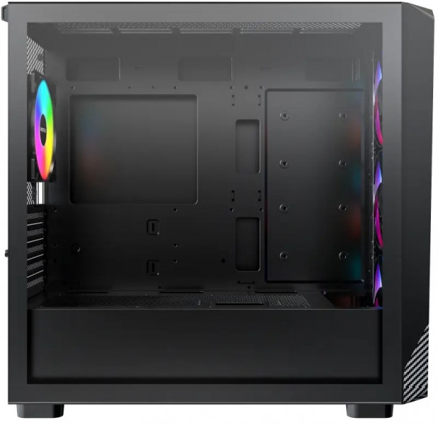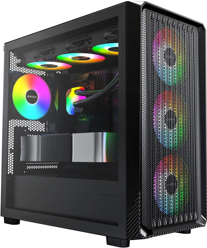 Montech X5M — це компактний корпус, який поєднує агресивний ігровий дизайн із практичністю. Зовні він нагадує болід завдяки карбоновому принту на передній панелі та суцільній сітчастій вставці з 35% відкритістю. Усередині — місце для потужної "начинки": відеокарти до 405 мм, процесорний кулер до 165 мм і блок живлення ATX довжиною до 230 мм.