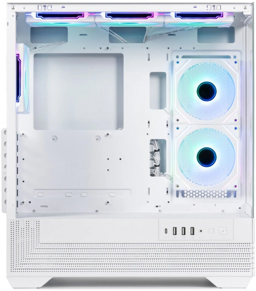 Зручність використання доповнюють порти на боковій панелі: USB Type-C, USB 3.0, два USB 2.0 та HD-Audio. Для накопичувачів передбачено універсальні відсіки під 2×3.5" і 2×2.5" диски, що дає змогу гнучко організувати сховище. Сталевий каркас товщиною 0,7 мм гарантує міцність і стабільність, не жертвуючи естетикою та легкістю складання.