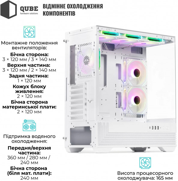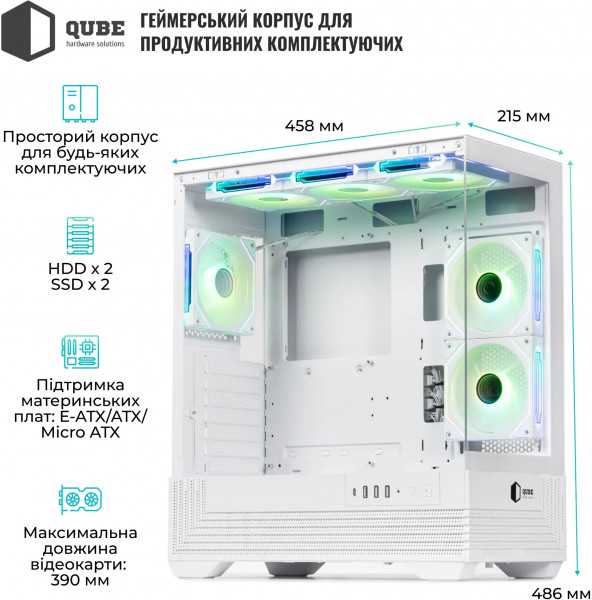 Розміри корпусу роблять QUBE FORT ARGB компактним, але водночас містким. Він ідеально пасує для створення потужного ПК з акцентом на візуальну привабливість і ефективне охолодження.