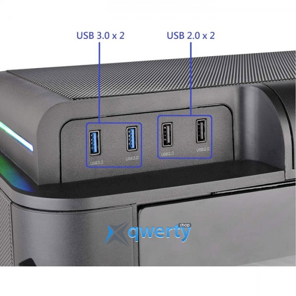 В правой верхней части корпуса имеются по два порта USB 3.0 и 2.0. С другой стороны, наряду со стандартными кнопками включения, выключения и разъемов для гарнитуры, расположилась кнопка RGB для переключения режимов работы подсветки внутреннего контроллера.