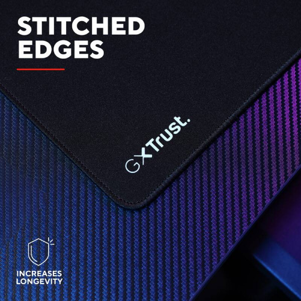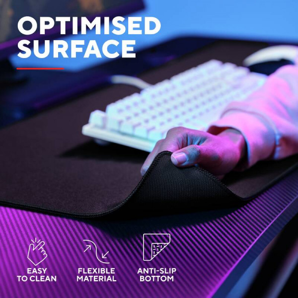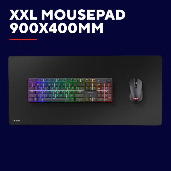 Ігрова поверхня Trust GXT 759 XXL забезпечує комфортну та точну гру. Завдяки розміру 900x400 мм вона вміщує клавіатуру та мишу, а гумова основа запобігає ковзанню. Оптимізована текстура гарантує точність рухів, а прошиті краї захищають від зношування.