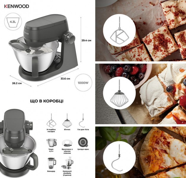 Аксесуари для основної чаші: К-образна насадка; крюк для тіста; вінчик.