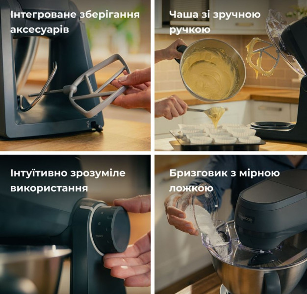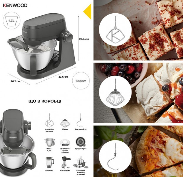 Аксесуари для основної чаші: К-образна насадка; крюк для тіста; вінчик.