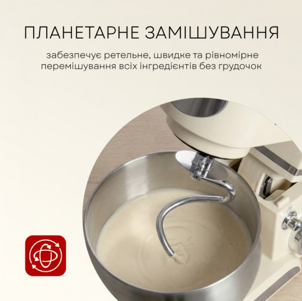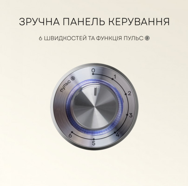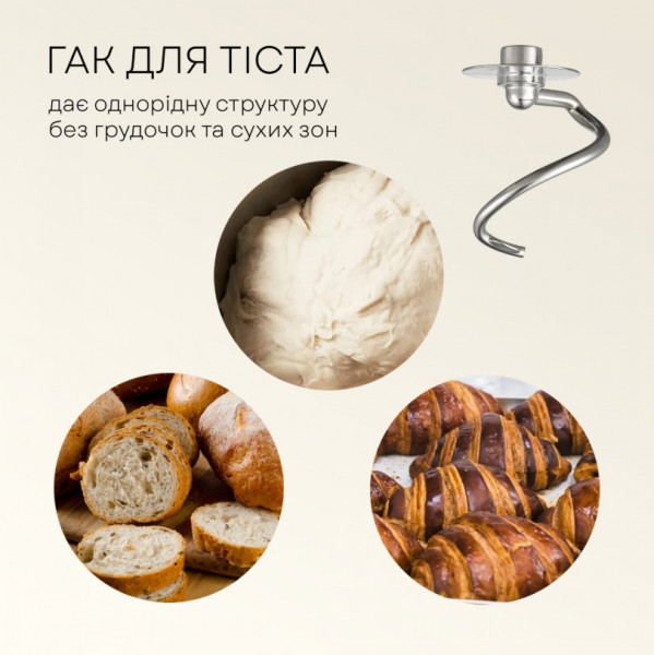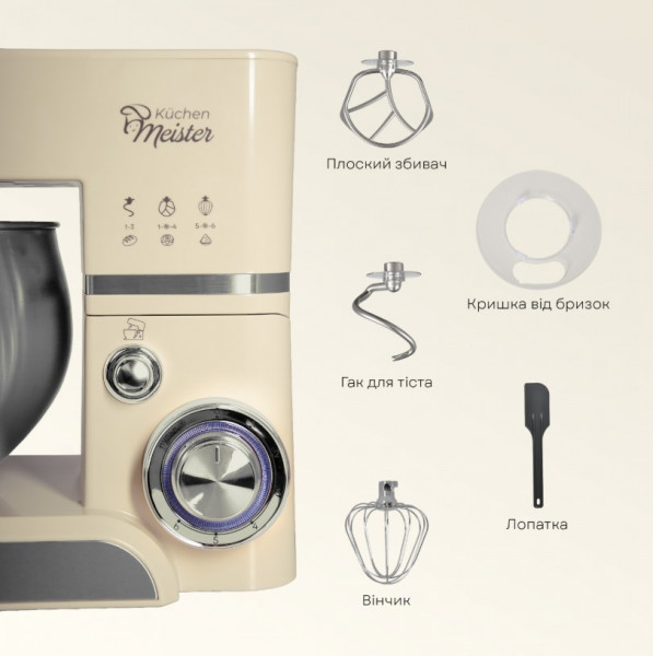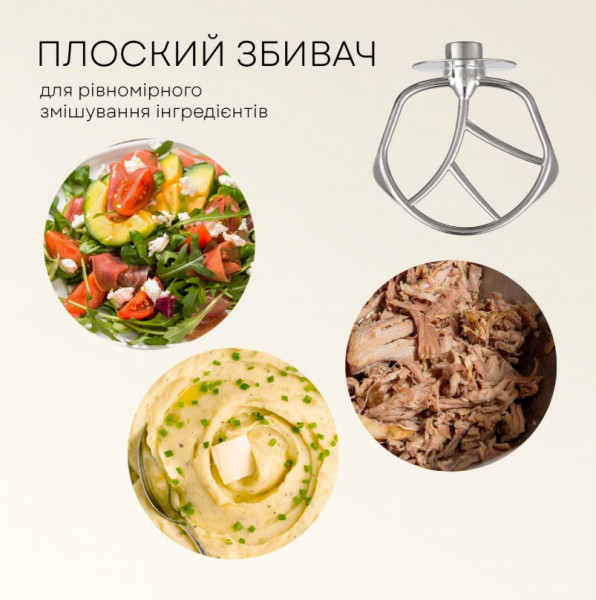 Насадки: гак для тіста, плоский збивач, вінчик, лопатка з пластику