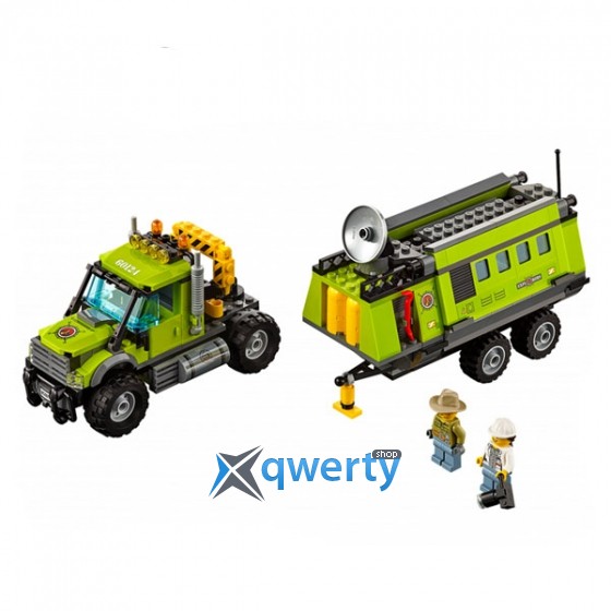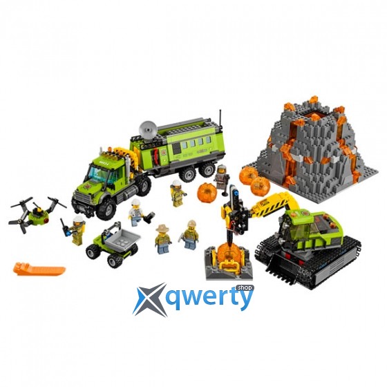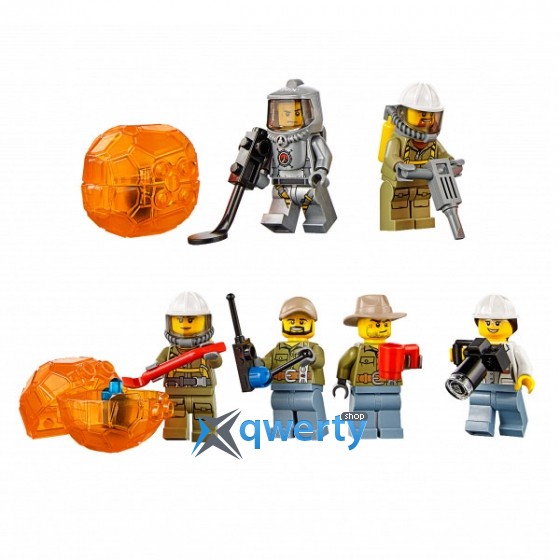 В наборе LEGO City База исследователей вулканов 824 детали, в том числе 6 игровые фигурки персонажей (Водитель джипа-вездехода, 2 Исследователя, Научный сотрудник, Пилот радиоуправляемого самолета, Водитель гусеничного крана) и игровые аксессуары (лавовые шары с кристаллами, рабочие инструменты, фотокамера, рация и пр).