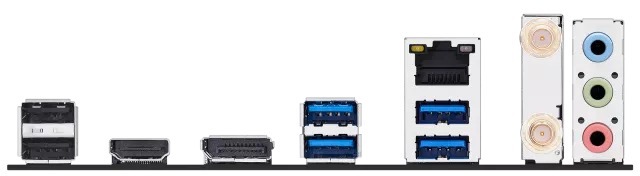 Підключення до мережі забезпечує контролер Intel Wi-Fi 6 та гігабітний LAN-порт. На задній панелі розташовано сучасний набір інтерфейсів: HDMI, DisplayPort, USB 3.2 Gen 2, USB 3.2 Gen 1, аудіороз’єми Realtek та оптичний S/PDIF.