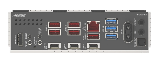 Плата має 4 слоти для оперативної пам'яті та різноманітні роз'єми для підключення зовнішніх пристроїв. Задня панель містить 2 USB 3.2 Gen 2 x 2 Type-C, 1 USB 3.1 Gen 2 Type-C, 3 USB 3.1 Gen 1 Type-A та 5 USB 3.1 Gen 2 Type-A, що забезпечує величезний потенціал для розширення вашої системи.