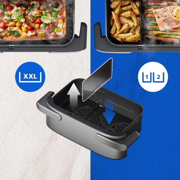 Будь то вечеря для двох або обід для всієї великої родини, ви завжди будете готові. Готуйте в двох окремих кошиках об'ємом 3 л + 6 л для повсякденної зручності або об'єднайте їх в один величезний Megabasket об'ємом близько 10 л для особливо важливих страв - досить великий для 2,5 кг картоплі фрі, 1,9 кг ребер або цілої курки. Використовуйте режими Steamfry, Steam або Airfry одночасно для ідеальної текстури щоразу.