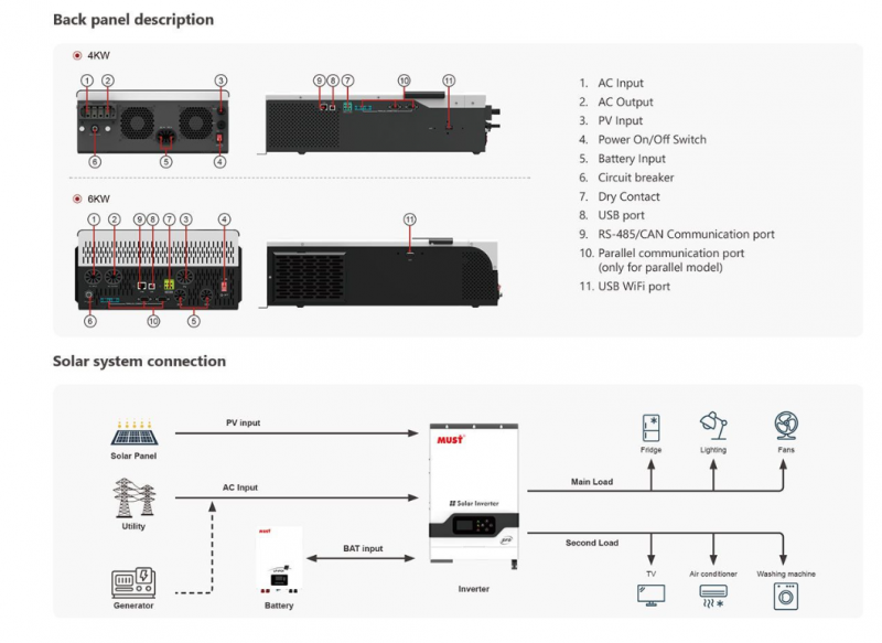 MUST PV18-6048 PRO II - гібридний сонячний інвертор потужністю 6 кВт, призначений для побудови автономних і резервних систем електропостачання будинку, дачі або комерційного об'єкта. Модель підтримує однофазне підключення, працює з вихідною напругою 230 В і частотою 50/60 Гц, формуючи чисту синусоїду для стабільного живлення побутової техніки та чутливого обладнання. Інвертор оснащений MPPT-контролером з діапазоном вхідної напруги PV-поля 120-500 В і розрахований на роботу з акумуляторною батареєю 48 В, забезпечуючи максимальний струм заряду АКБ 120 А. Модель підтримує вбудований моніторинг, паралельне під'єднання, під'єднання генератора і функцію ДБЖ, а для управління передбачено інтерфейси RS485 / USB / CAN / Dry Contact / Wi-Fi. Інвертор оснащений LCD-дисплеєм і LED-індикаторами, має активне охолодження, клас захисту IP20 і ККД 92%. Для безпечної експлуатації передбачено захист від перевантаження, короткого замикання, стрибків напруги, зворотної полярності, глибокого розряду, перезарядження і перегріву. Розміри пристрою становлять 505x309x147 мм, вага - 12.5 кг.