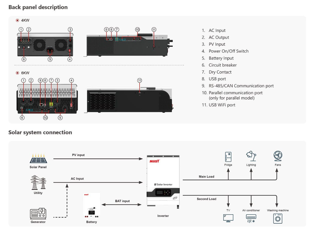 MUST PV18-6048 PRO II - гібридний сонячний інвертор потужністю 6 кВт, призначений для побудови автономних і резервних систем електропостачання будинку, дачі або комерційного об'єкта. Модель підтримує однофазне підключення, працює з вихідною напругою 230 В і частотою 50/60 Гц, формуючи чисту синусоїду для стабільного живлення побутової техніки та чутливого обладнання. Інвертор оснащений MPPT-контролером з діапазоном вхідної напруги PV-поля 120-500 В і розрахований на роботу з акумуляторною батареєю 48 В, забезпечуючи максимальний струм заряду АКБ 120 А. Модель підтримує вбудований моніторинг, паралельне під'єднання, під'єднання генератора і функцію ДБЖ, а для управління передбачено інтерфейси RS485 / USB / CAN / Dry Contact / Wi-Fi. Інвертор оснащений LCD-дисплеєм і LED-індикаторами, має активне охолодження, клас захисту IP20 і ККД 92%. Для безпечної експлуатації передбачено захист від перевантаження, короткого замикання, стрибків напруги, зворотної полярності, глибокого розряду, перезарядження і перегріву. Розміри пристрою становлять 505x309x147 мм, вага - 12.5 кг.
