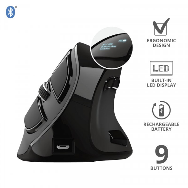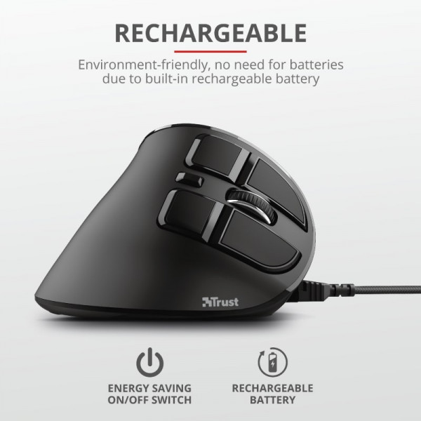 Trust Voxx Ergonomic Rechargeable Wireless Mouse призначена для користувачів, які шукають максимальний комфорт під час тривалої роботи за комп'ютером. Її вертикальна форма допомагає зменшити навантаження на зап'ястя та покращити ергономіку робочого процесу. Миша має 9 програмованих кнопок, серед яких додаткові бокові кнопки для зручної навігації у браузері, а також спеціальну кнопку для регулювання DPI, що дозволяє налаштувати швидкість курсора.