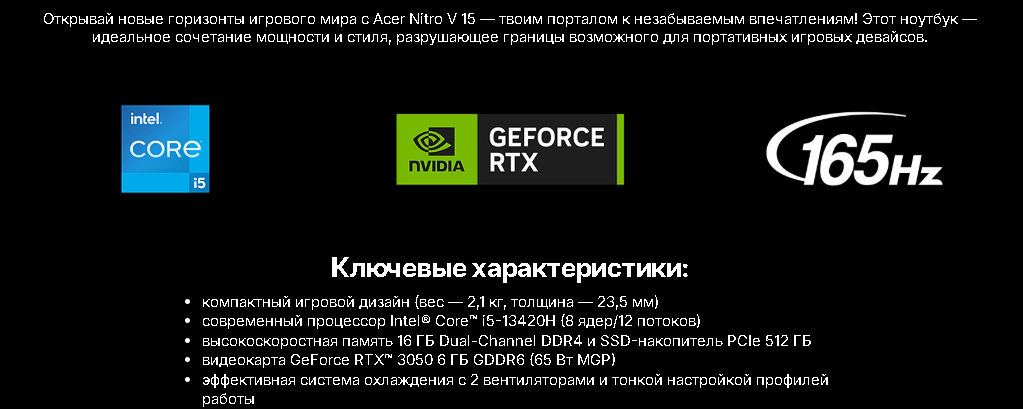 Диагональ экрана 15,6" / Разрешение экрана 1920x1080 Full HD / Частота обновления экрана 165 Гц / IPS / Матовое / Intel Core i5-13420H 2,1 (4,6) ГГц / RAM 16 GB / SSD 512 / Nvidia GeForce RTX 3050 6 ГБ / Без ОС