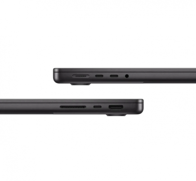MacBook Pro оснащений усім необхідним для професійної роботи. У розпорядженні користувача три порти Thunderbolt 4 або 5, порт HDMI, роз'єм MagSafe 3 для зарядки, слот для карт пам'яті SDXC і стандартний аудіороз'єм для навушників. Ви можете підключати високошвидкісні периферійні пристрої, зовнішні монітори та працювати без обмежень.