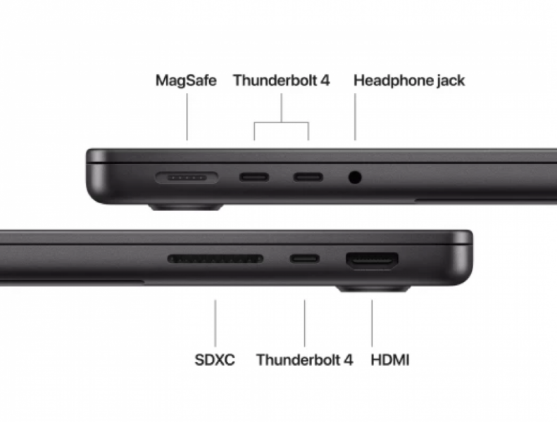 MacBook Pro оснащений усім необхідним для професійного підключення. У розпорядженні користувача — три порти Thunderbolt 4 або 5, порт HDMI, роз’єм MagSafe 3 для заряджання, слот для карт пам’яті SDXC та стандартний аудіороз’єм для навушників. Ви можете підключати високошвидкісні периферійні пристрої, зовнішні монітори та працювати без обмежень.